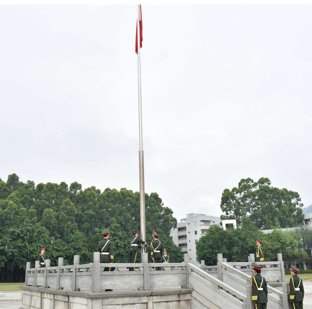 国旗护卫队队员们迈着坚毅的步伐,护卫着鲜红的国旗走向升旗台。五星红旗伴着激昂有力的《义勇军进行曲》在朝阳广场上空冉冉升起,全体师生行注目礼。