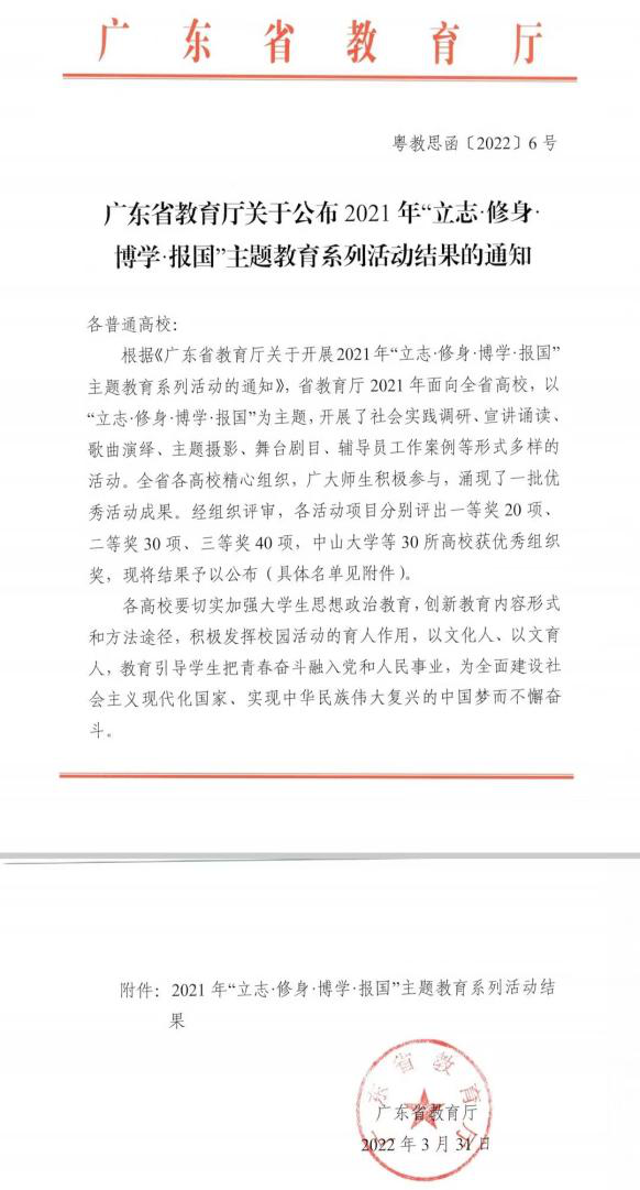 2021年“立志·修身·博学·报国”主题教育系列活动由广东省教育厅主办并面向全省高校开展,旨在贯彻落实习近平总书记关于高校思想政治工作的重要论述,繁荣校园文化,积极发挥校园活动的育人作用。该主题教育系列活动形式多样,包括社会实践调研类、宣讲诵读类、歌曲演绎类、主题摄影类、舞台剧目类、辅导员工作案例类等6类项目。