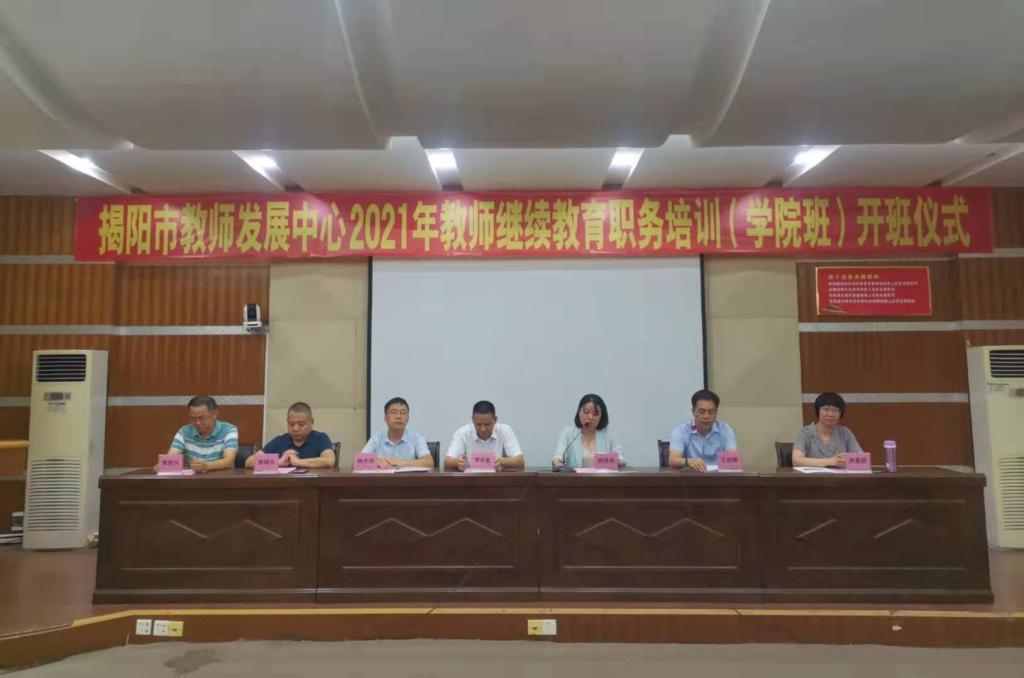 7月21日,揭阳市2021年中小学、幼儿园教师继续教育职务培训(学院班)开班仪式在学院慈云教学大楼举行。学校副院长李桂鑫,揭阳市教育局副局长、市教师发展中心主任杨丹华,榕城区教育局副局长陈晓生,空港经济区教育局副局长黄耿兴,市教师发展中心副主任郝志刚,学校思政部主任洪曼丽出席开班仪式。活动由学校继续教育部主任王创锋主持。