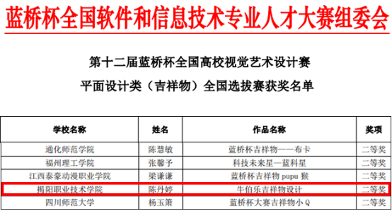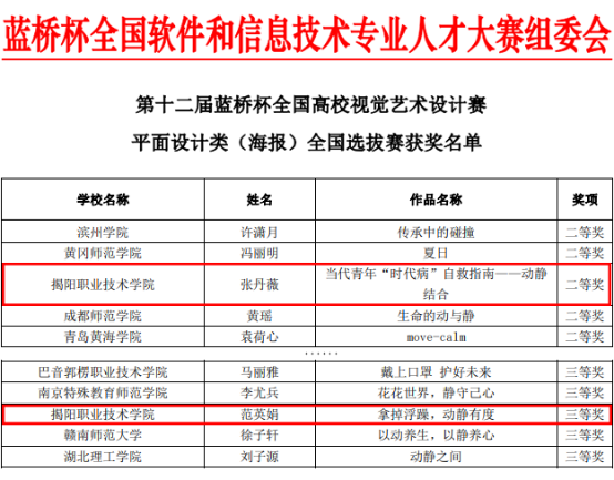 近日,第十二届“蓝桥杯”全国软件和信息技术专业人才大赛 ——视觉艺术设计赛传来喜讯,永利信息工程系学生在本届赛事中勇夺佳绩。在信息工程系陈锐彬、李宗辉、林洁新等老师的精心指导下,张丹薇、陈丹婷、范英娟等同学分别获得该赛项二等奖和三等奖。