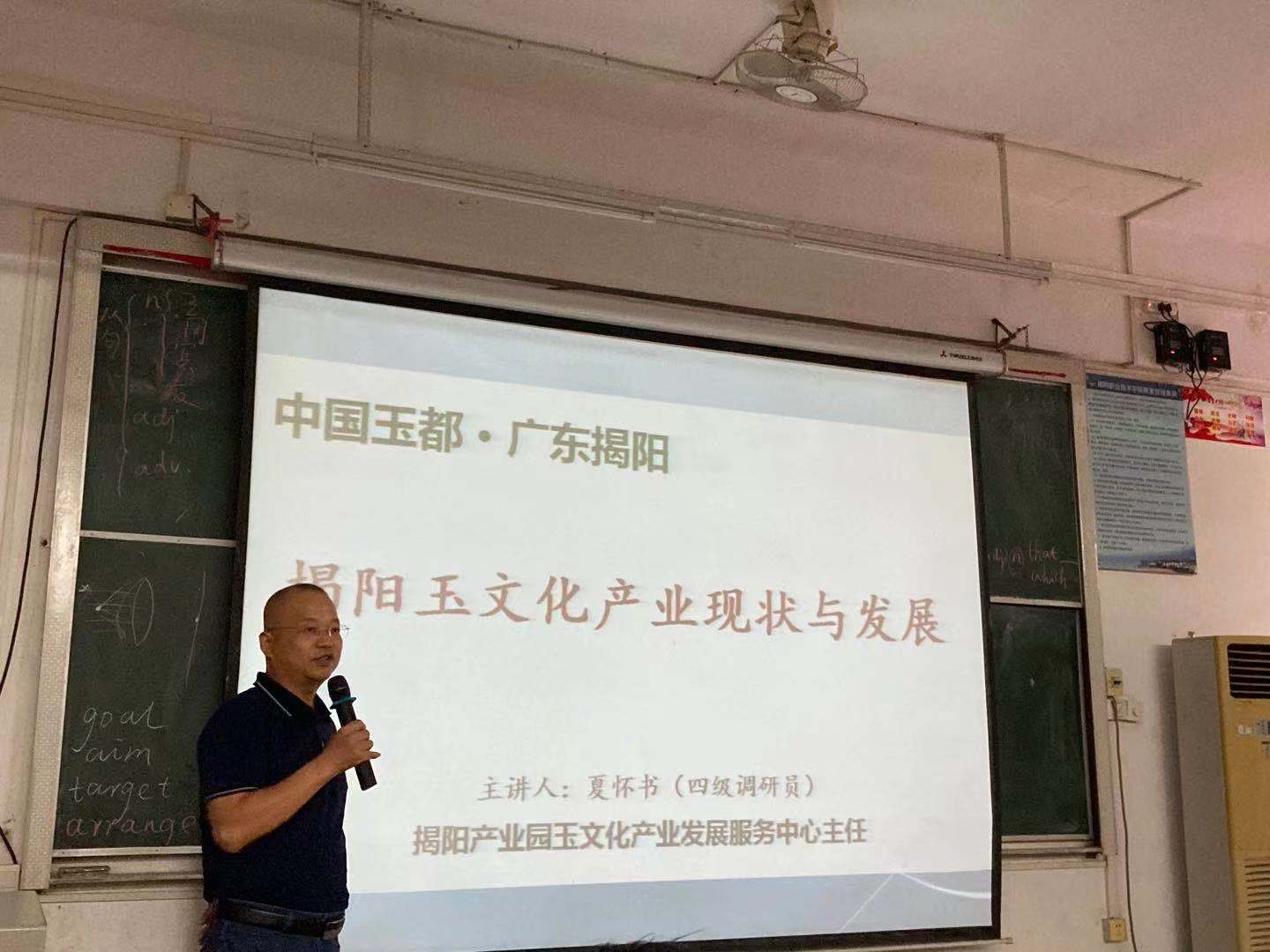 6月4日下午,应机电工程系的邀请,揭阳产业园玉文化产业发展服务中心主任、产业园文旅体育局长夏怀书到校为宝玉石专业学生作题为“揭阳玉文化产业现状与发展”的专题讲座。机电工程系总支书记方春城及宝玉石专业师生一百多人聆听了讲座。讲座在教学楼CT31教室举行,由该系副主任林若波主持。