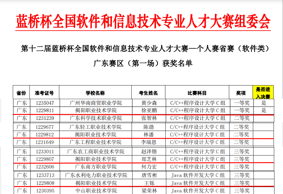 4月28日,从工业和信息化部人才交流中心主办的第十二届“蓝桥杯”全国软件和信息技术专业人才大赛广东省赛区组委会传来喜讯,永利信息工程系4名学生在众多选手中脱颖而出,再创佳绩。其中,由薛晓桂老师指导的学生徐亚鹏勇夺软件类C/C++程序设计赛项一等奖,并成功晋级将于6月初举行的全国总决赛。由林洁新老师指导的学生林潘获得二等奖,由李宗辉、刘彩琼指导的学生郑芝林、王铄均获得三等奖。