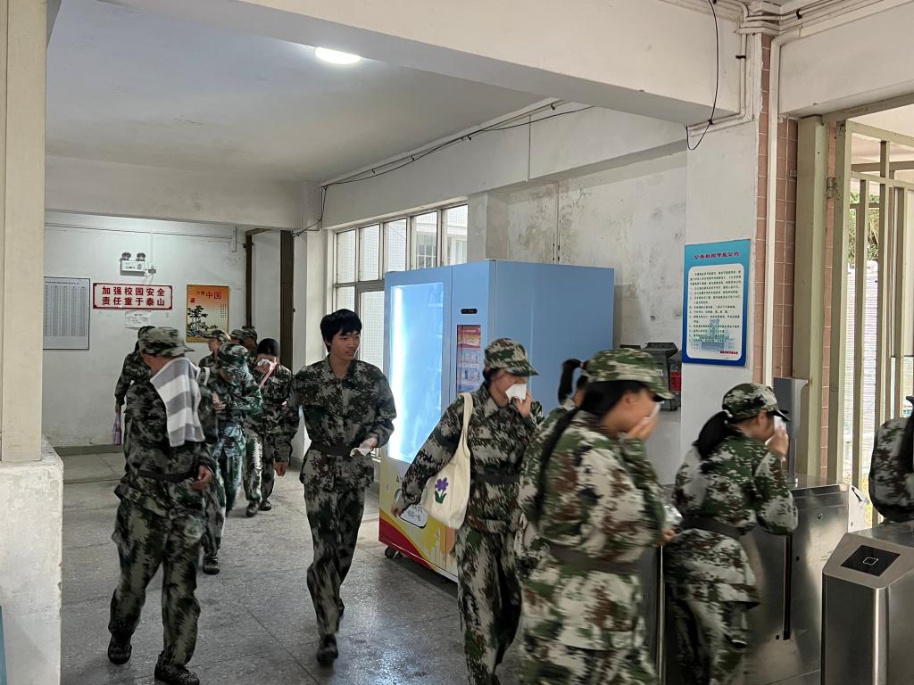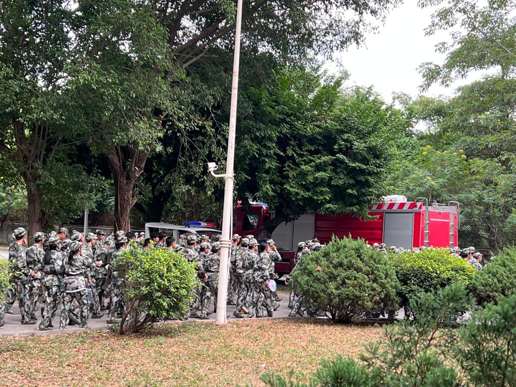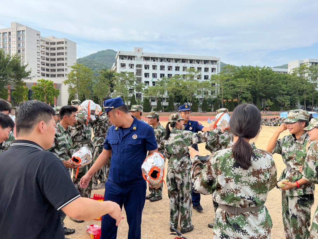 学生从宿舍疏散到足球场后集合,消防大队教官为同学们讲解演示消防器材的作用及操作,同时邀请了同学们共同参与实操,手把手教学。