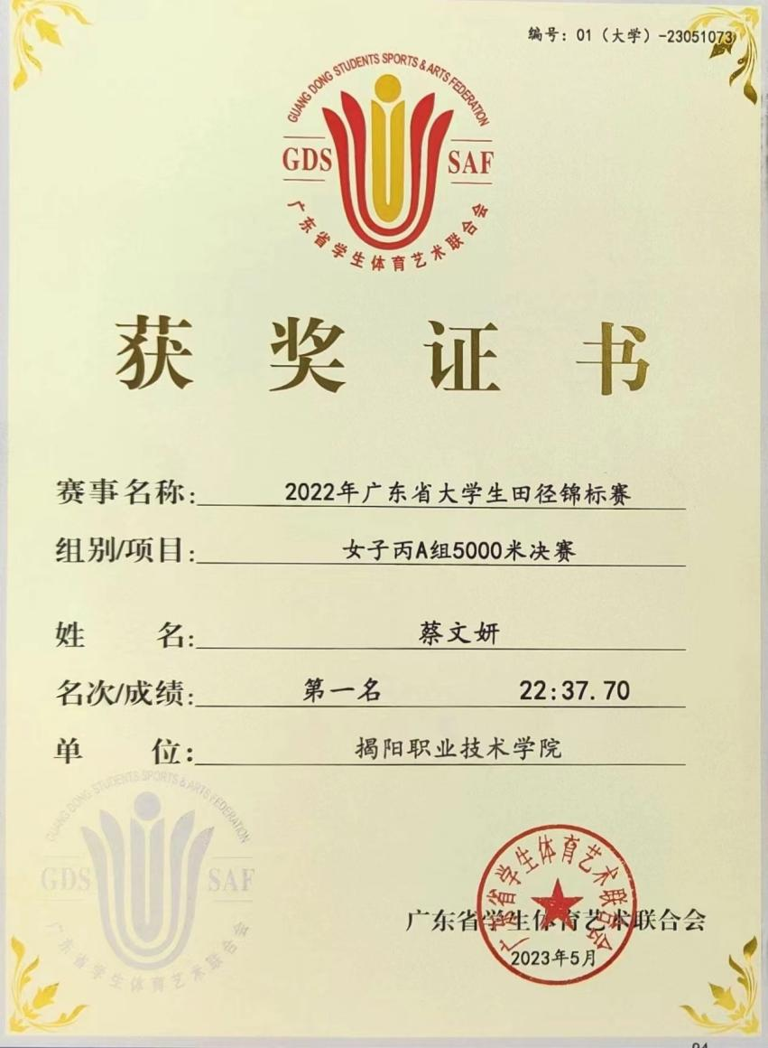 蔡文妍:女子5000米 第一名;女子1500米 第四名;