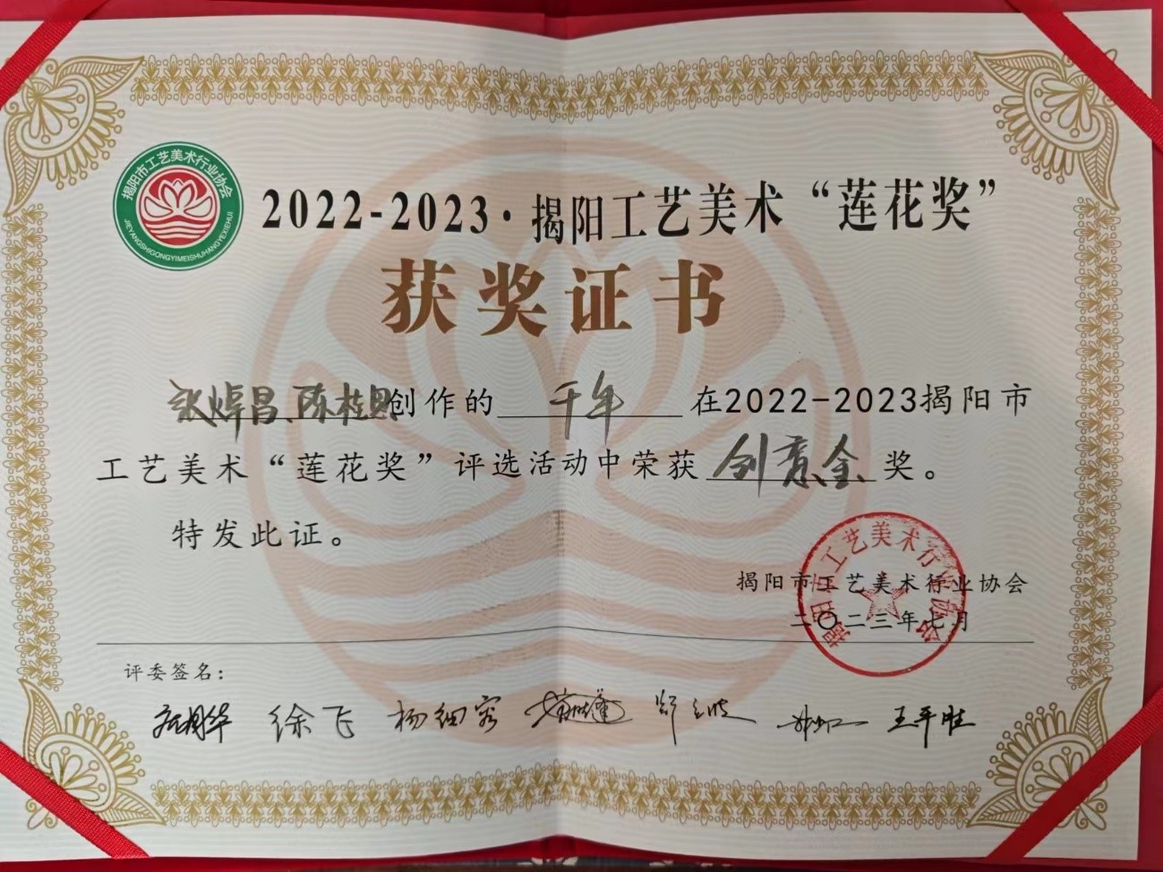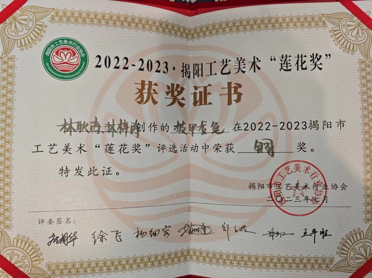 “莲花奖”是揭阳市工艺美术行业专业评选和展览活动,奖项包含特别金奖、金奖、银奖、铜奖、创意金奖、最佳工艺奖。“莲花奖”的创设旨在激发揭阳工艺美术人才的创作热情,发掘和培养有志于继承发扬传统工艺美术的优秀人才,增进揭阳工艺美术行业内部与外界的双向交流,推动揭阳工艺美术事业的繁荣发展,是揭阳市工艺美术界的最高奖项,至今已举办多届。本次“莲花奖”邀请了中国工艺美术大师常世琪、仵应汶、吴尧辉、潘惊石、张民辉、谢华、杨锐华、张炳光、李中庆、马志东、莫伟坤、范安琪等大师出席,具有很高的技术含金量。永利学生能在此次大赛中脱颖而出,荣获创意金奖,彰显出较高的行业水准,对推动宝玉石专业建设和实训教学质量的提高,具有很好的促进作用。