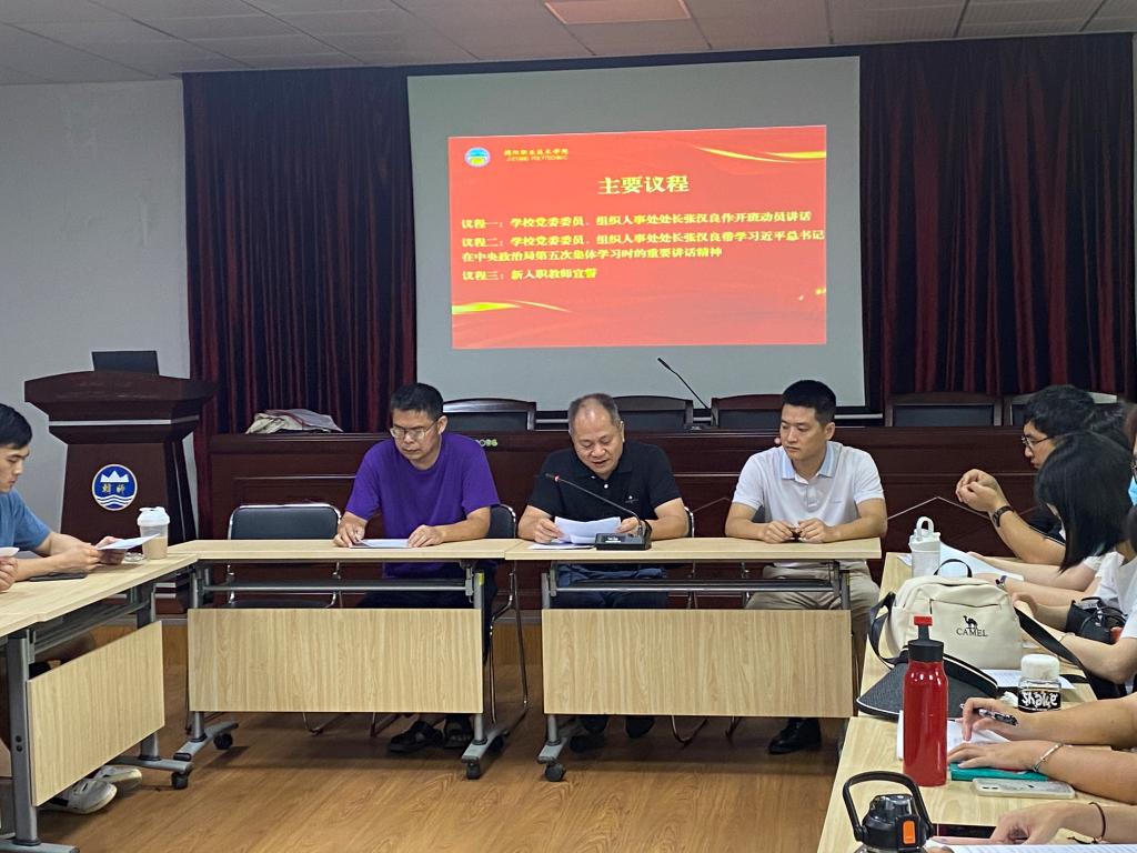 此次活动有领导作动员讲话、带学习近平总书记在中央政治局第五次集体学习时的重要讲话精神和新入职教师宣誓三个议程。张汉良在作动员讲话时提出三点要求:一是要求新入职教师要珍惜机会,静下心来认真学习;二是要求新入职教师要学以致用,挑起立德树人的光荣担子;三是要求新入职教师要严肃纪律,保证顺利完成培训任务。在带学时指出,组织新入职教师岗前培训、加强教师队伍建设是贯彻落实习近平总书记在中央政治局第五次集体学习时重要讲话精神的重要举措。