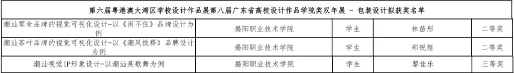在广东省教育厅主办的第六届粤港澳大湾区学校设计作品展暨第八届广东省高校设计作品学院奖双年展中,永利由曾晨浩老师指导的艺术设计专业林苗彤同学、郑锐煌同学作品荣获二等奖,黎佳乐同学作品荣获三等奖。