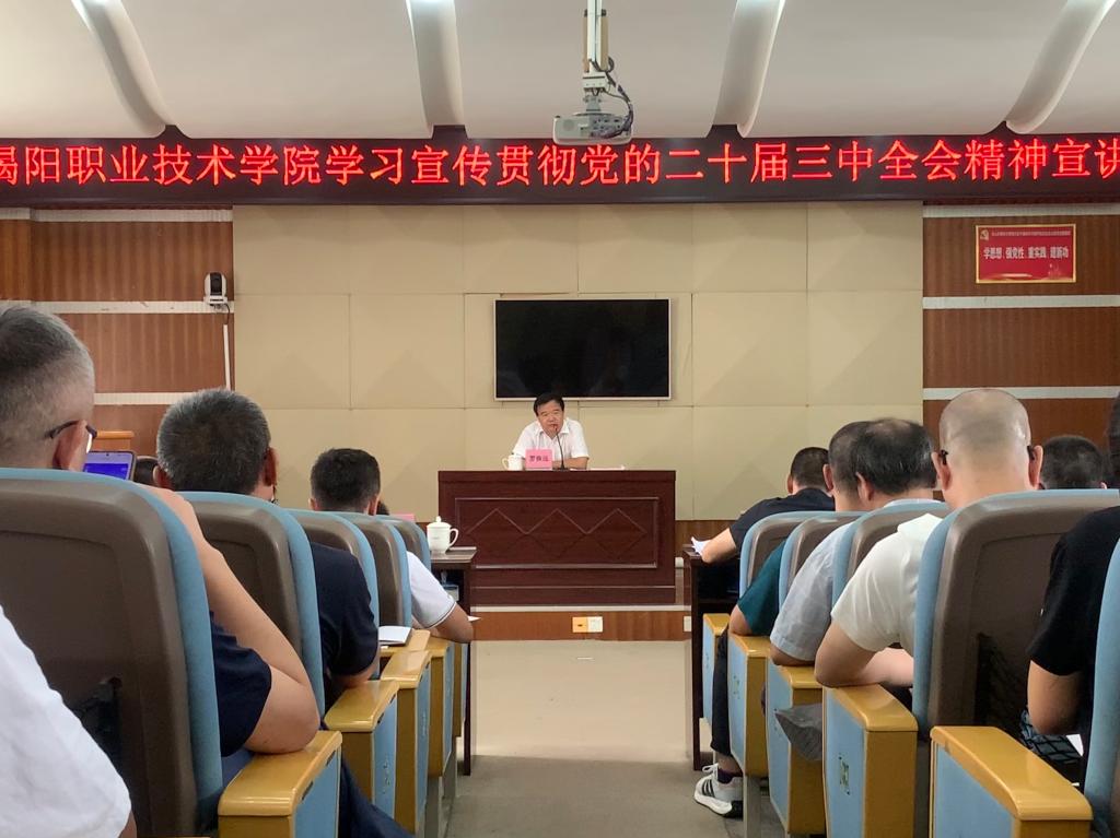 宣讲报告深入学习贯彻习近平总书记在党的二十届三中全会上的重要讲话精神和全会精神,深刻领会习近平总书记关于全面深化改革的一系列新思想、新观点、新论断,深刻把握党的二十届三中全会《决定》的丰富内涵,详细讲解了学校党员干部学深悟透党的二十届三中全会精神需要把握的重点内容,并结合学校发展实际,就贯彻落实党的二十届三中全会精神,推动学校高质量发展作出部署。