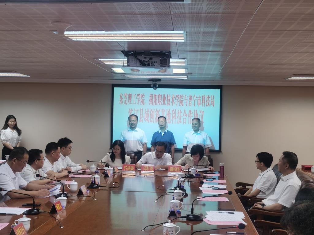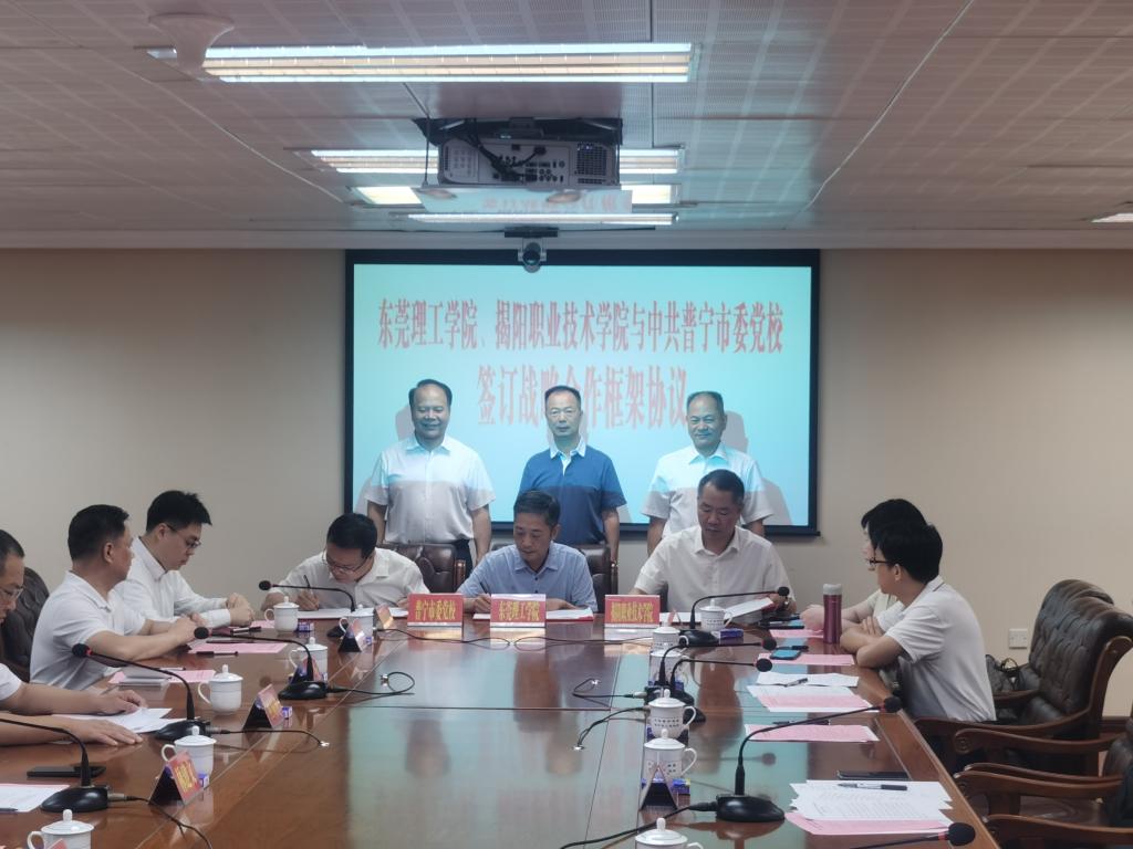 会上,东莞理工学院、77779193永利官网与中共普宁市委党校签订战略合作框架协议,东莞理工学院、77779193永利官网与普宁市科技局签订县域创新基地科技合作协议,东莞理工学院与普宁市船埔镇人民政府签订共建南阳山根据地(船埔)红色文化实践基地框架协议,并举行两校“大学生社会实践基地”揭牌仪式。会议还听取了普宁市“双百行动”工作专班工作情况汇报。