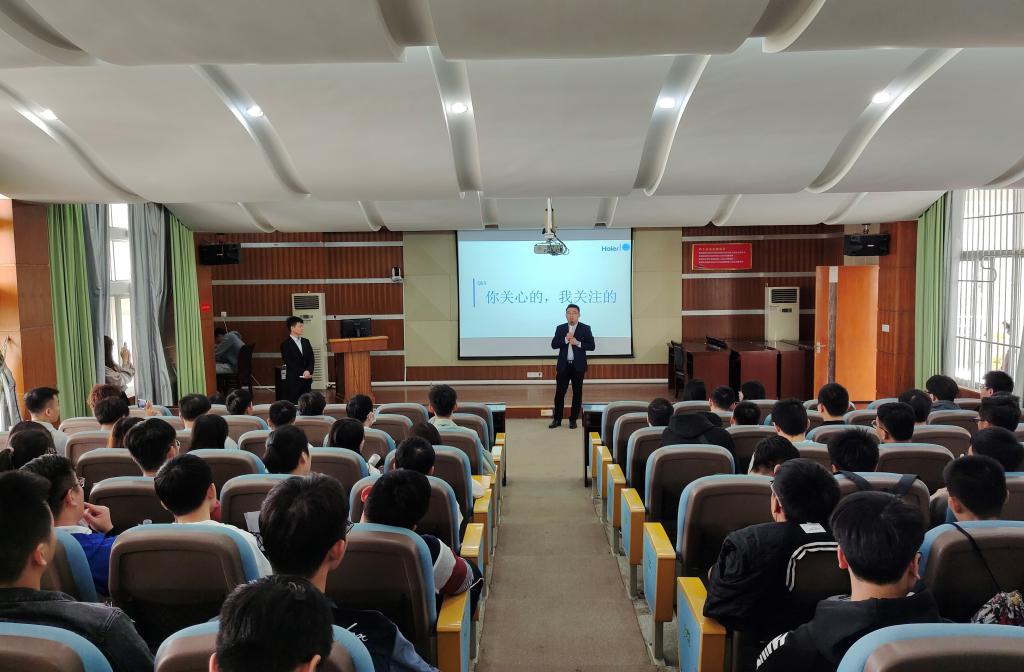 曲经理详细介绍了公司对人才的需求及培养,勉励同学们在企业踏实学习,努力奋斗,一步一个脚印稳步发展为企业的中坚人才及业务骨干,也期待同学们能够选择在海尔实习及就业,相信同学们一定能够在海尔这个创新创业的平台上发光发亮,实现自己的职业价值,为学习生涯献上一份满意的毕业献礼。