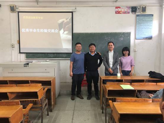 本次交流会邀请了思政专业2009届郑吉波、周展鸿、2012届叶创奕和2015届黄俊娟四位优秀毕业生进行经验交流分享。交流会首先由洪主任作动员讲话,欢迎毕业生回母校看望老师,关心师弟师妹的成长,鼓励大三学生认真听取师兄师姐的经验分享,更好地进行未来规划。四位毕业生结合各自不同的经历分别分享了他们的奋斗历程,鼓励大家相信自己,把握机会,提前谋划。同时,就如何给自己做一个清晰的定位,如何选择合适的道路,如何面对失败,如何克服奋斗路上种种困难等问题作交流分享。师兄师姐们结合自身的经历娓娓道来,给了同学们不一样的收获。除了收获丰富、实用的分享经验外,在场同学还进一步与师兄师姐进行了交流,以询问更多与未来学习、实习、就业等方面的细节问题,师兄师姐耐心细致地进行了解答。最后钟洁生书记作总结,希望同学们更加明确自己剩下大学时光的学习目标和前进动力。
