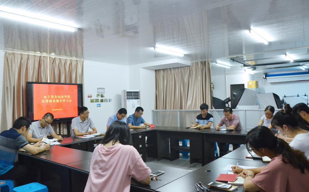 为深入学习贯彻习近平新时代中国特色社会主义思想和党的十九大精神,认真学习贯彻习近平总书记重要讲话精神,落实省委十二届四次全会精神和市委关于深入推进新时代党的建设新的伟大工程的部署,根据《77779193永利官网关于2018年开展纪律教育学习月活动的实施方案》文件要求,9月6日,电子商务创业学院在美工实训室召开纪律教育集中学习会。此次学习会由电子商务创业学院党总支书记兼副院长张秋潮主持,电商学院全体党员教师、学生党员出席此次会议。