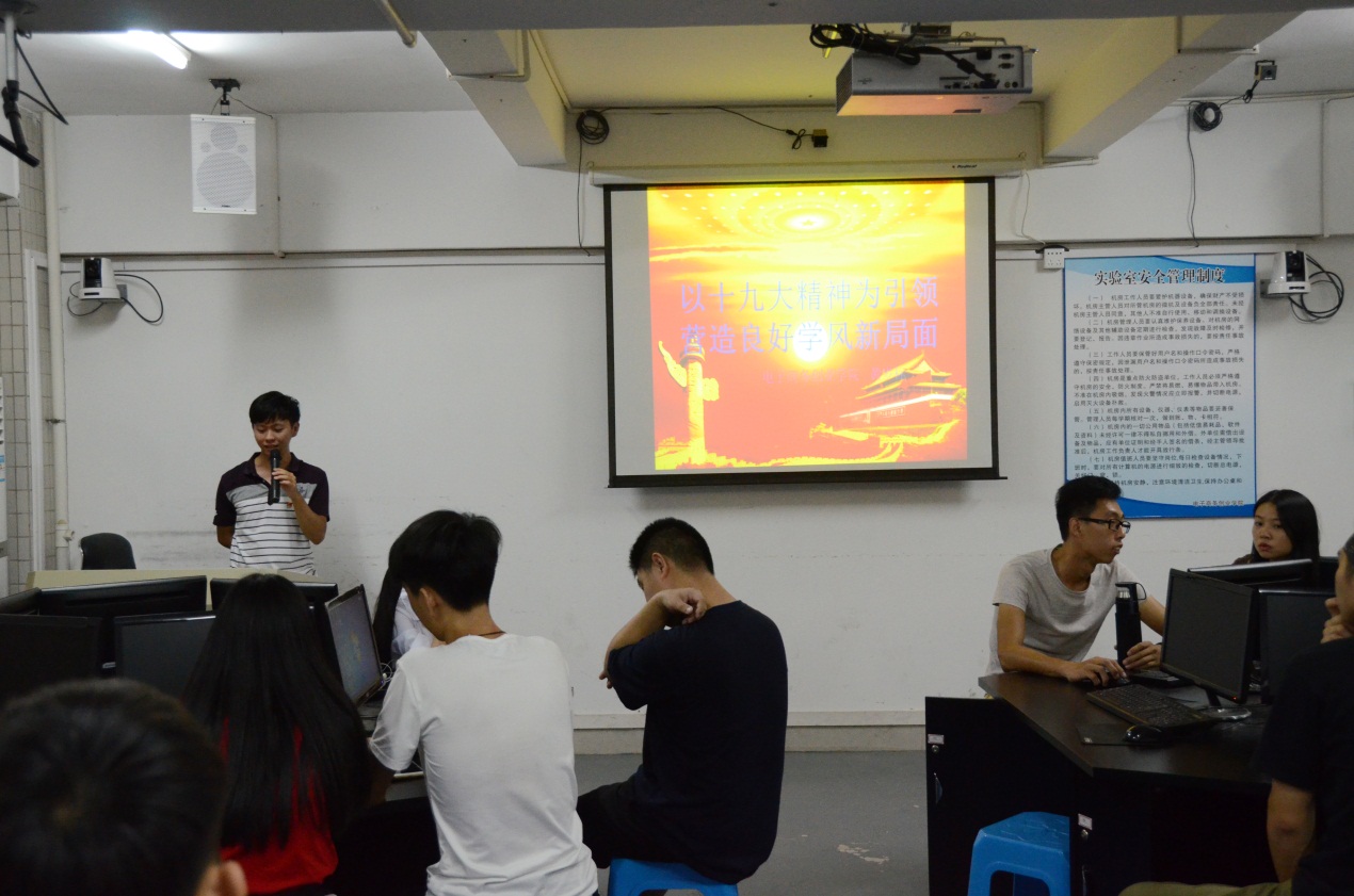 为全面落实中共广东省委教育工作委员会《中共广东省委教育工作委关于组织开展党的十九大精神“六个一百”宣讲行动的通知》,全面学习贯彻党的十九大精神,5月29日,电子商务创业学院在行政楼101会议室举行以“以十九大精神为引领,营造良好学风新局面”为主题的专题讲座,此次讲座由电子商务创业学院黄岁标老师主讲,电商学院大一全体学生参加此次讲座。