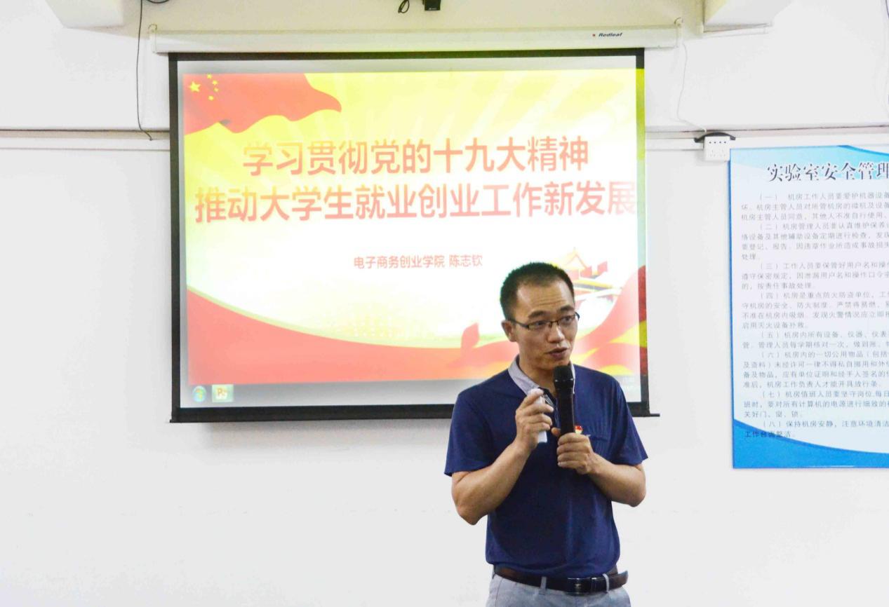 为全面落实中共广东省委教育工作委员会《中共广东省委教育工委关于组织开展党的十九大精神“六个一百”宣讲行动的通知》,全面学习贯彻党的十九大精神,电子商务创业学院于5月3日下午在行政楼101室举行以“学习贯彻党的十九大精神,推动大学生就业创业新发展”为主题的讲座,此次讲座由电子商务创业学院陈志钦老师主讲,电商学院二年级全体学生参加此次讲座。