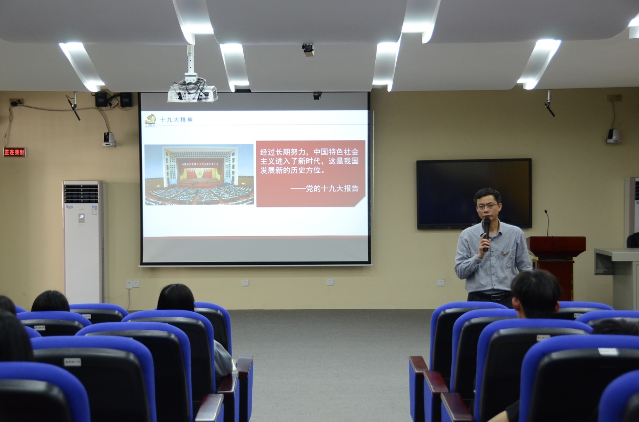 3月29日下午,电子商务创业学院党总支书记张秋潮在教学楼AT22为电子商务16级全体学生作以“十九大精神为引领,争当新时代‘六有’大学生”为主题的2018年春季学期思政第一课。