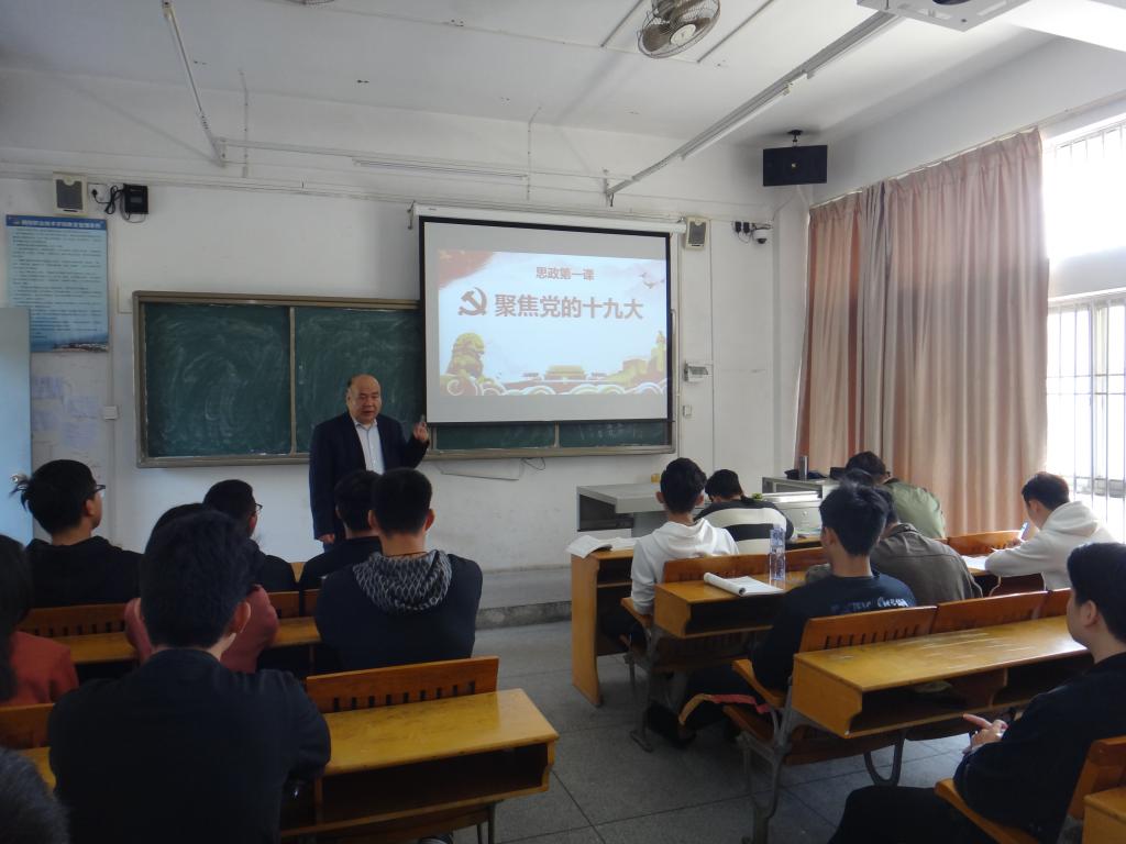 孙主任授课的主题为《再读十九大报告》。他分别从“党的十九次全国代表大会简介及重要意义”、“习近平总书记十九大报告内容精解”、“做合格党员,不忘初心,永远跟党走”这三个方面对十九大报告进行了详细解读。孙主任要求同学们要有“先天下人之忧而忧”的抱负,努力学习知识,积极参加社会实践,在实践中锻炼自己。
