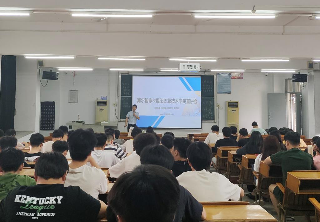 4月19日下午,海尔智家(华南园区)人力资源与行政总监梁昕、招聘总监干志勇、人事经理徐晓鹏举办校园招聘宣讲会。宣讲会在慈云教学楼CT31进行,模具设计与制造、机电一体化技术等专业近两百名学生参加。