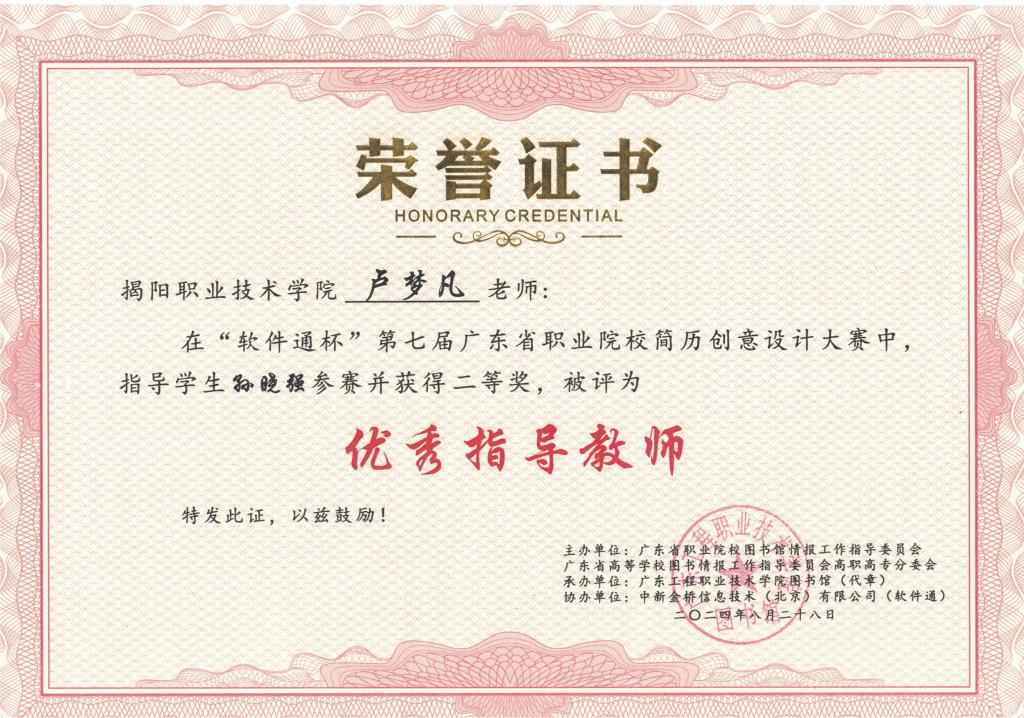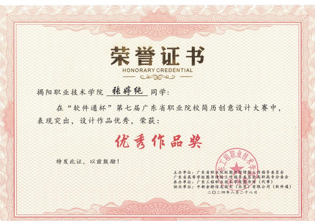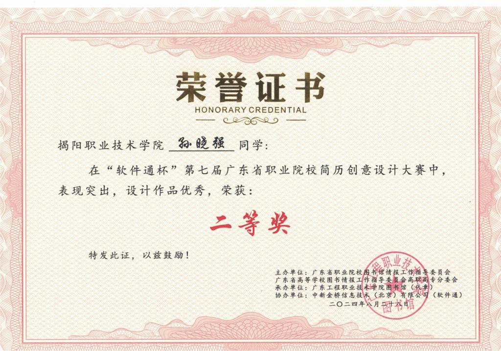 图书馆积极组织本校学生参加“软件通杯”第七届广东省职业院校简历创意设计大赛表现突出,其中外语系2022级孙晓强、张静纯同学荣获“二等奖”、“优秀作品奖”殊荣,外语系卢梦凡老师荣获“优秀指导教师奖”。