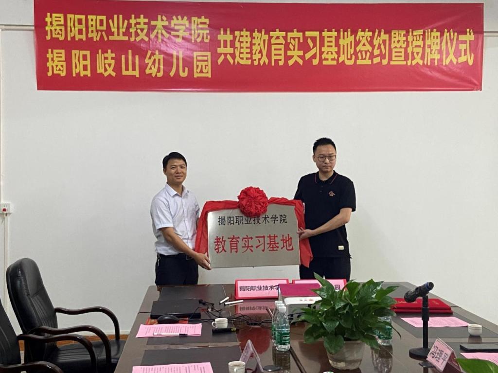 最后双方签订了共建教育实习基地协议书,并举行授牌仪式。李桂鑫副院长充分肯定揭阳岐山幼儿园的办学实力,并代表学校对此次的签约活动表示祝贺,期待校校双方围绕教育事业的共同目标和使命,通过深度、广度开展合作,取得更多实实在在的成果,推动校校合作高质量发展。