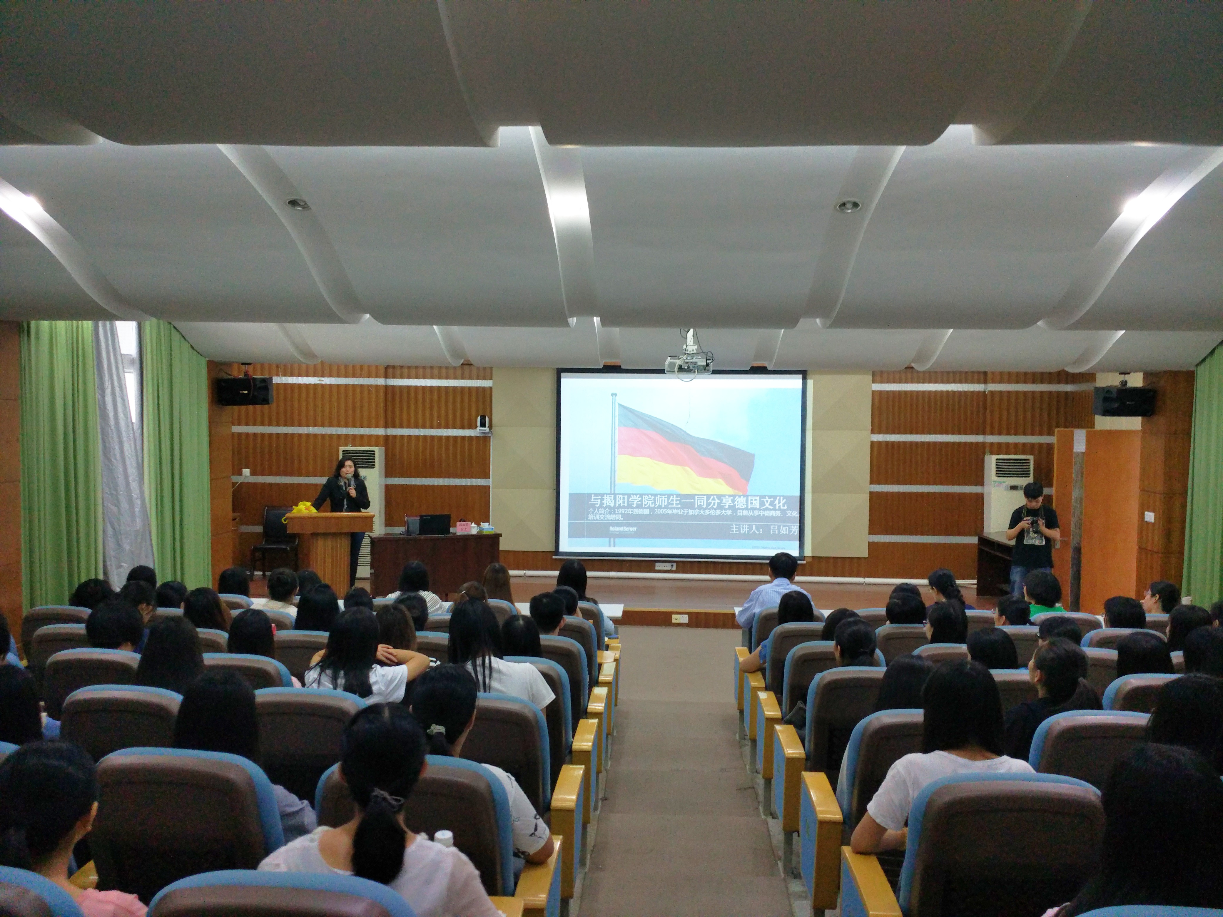 5月20日下午,根据学院安排,德籍华人吕如芳女士应邀在教学楼AT21举办“德国概况与教育文化”讲座,外语系师生共128人出席讲座。齐广武主任主持讲座。