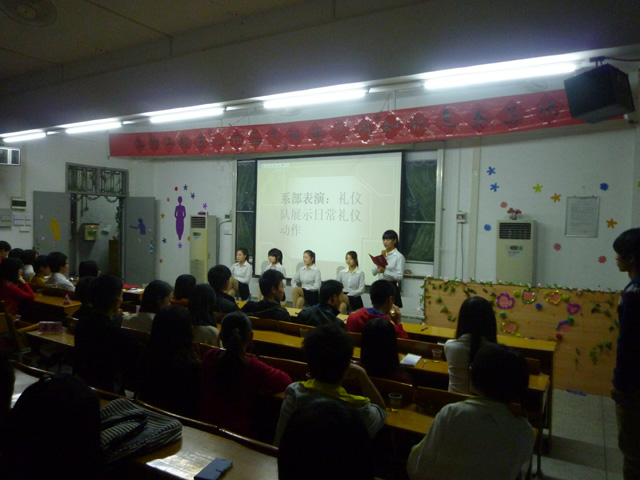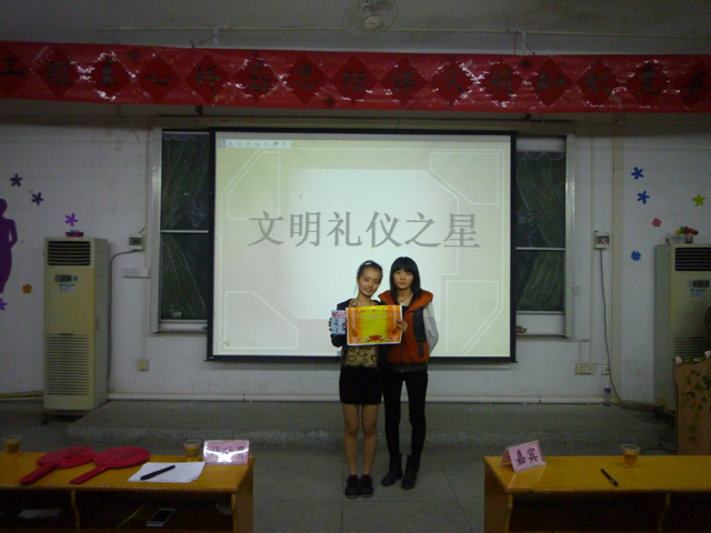 经过激烈角逐,获得一等奖的是方淑玲、李晓洁、陈曼婷、辛梓杰组成的“微笑礼仪队”,二等奖是黄晓丽、程海花、杨敏洁、王泽嘉组成的“闪电队”,三等奖是林丽嘉、庄展超、苏晓娟、杨晓莲组成的“咆哮队”,优秀奖是高思婷、林健伟、丁晓荧、杜舜舜组成的“大拇指队”,最佳组合奖是杜舜舜和丁晓荧,文明之星由黄晓丽同学夺得。比赛在系礼仪队展示礼仪规范动作中圆满结束了。