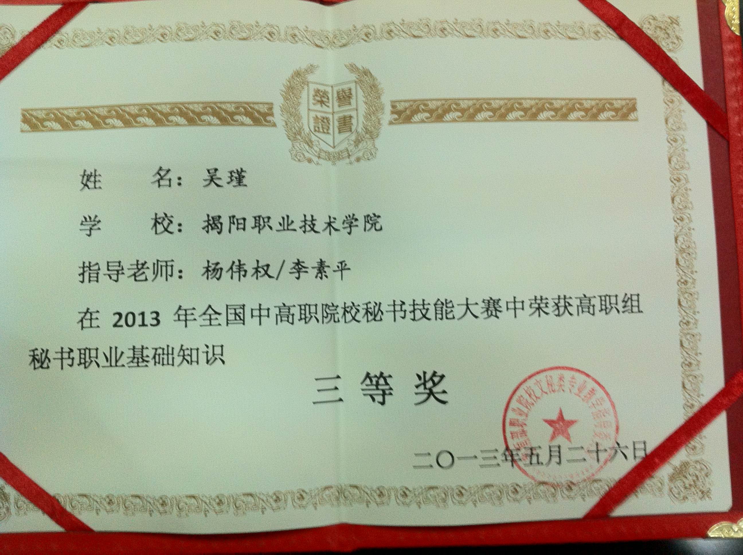 我院经管系文秘专业两名学生获2013年全国中高职业院校秘书技能大赛高职组秘书职业基础知识三等奖
